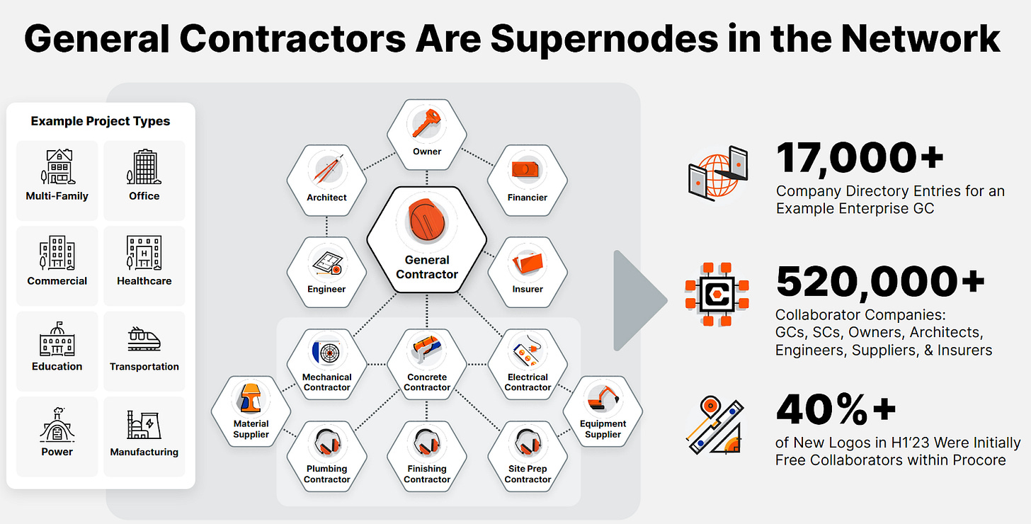 Procore’s vertical GTM strategy—focusing specifically on construction—has allowed it to build deep relationships in the industry. They host numerous construction conferences, blog about industry workflows, and even track input prices in real time on their website. This starkly contrasts competitors like Oracle, Trimble, and Autodesk, whose horizontal-to-vertical approach dilutes their focus. Procore’s dedicated vertical strategy ensures that its products remain tailored to the specific needs of construction professionals. This also boosts the conversion rate of contractors/designers using the platform as a free partner.